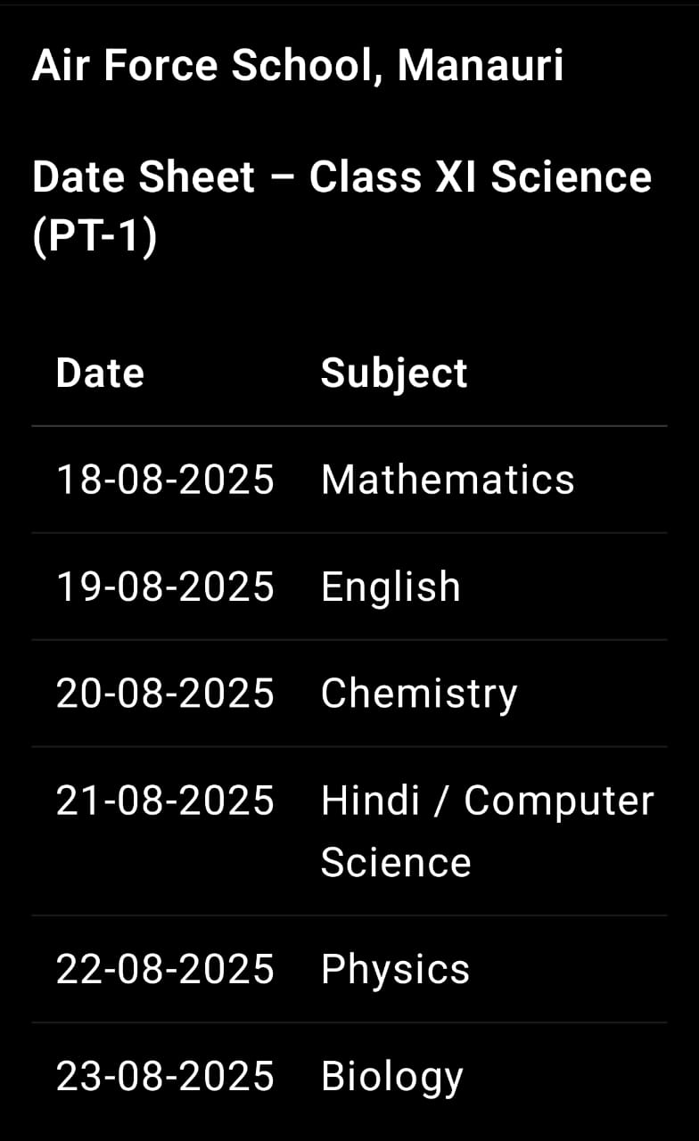 Periodic Test -I for CLass XI will commence from 18 Aug 25 as the time table.