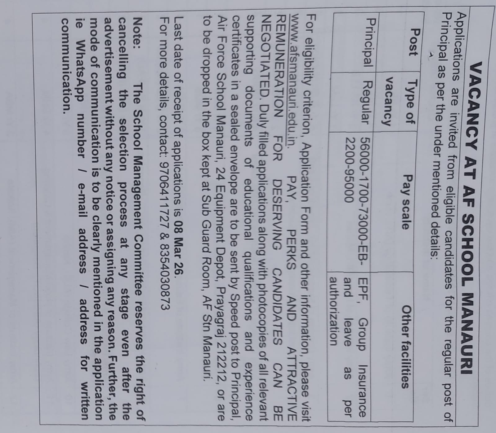 Air Force School Manauri Prayagraj invites applications for the post of Principal. Interested candidates submit the application by post to Air Force School Manauri. Eligibility criterion is given under the download section of this website homepage. Last date of receipt of application is 08 Mar 26.